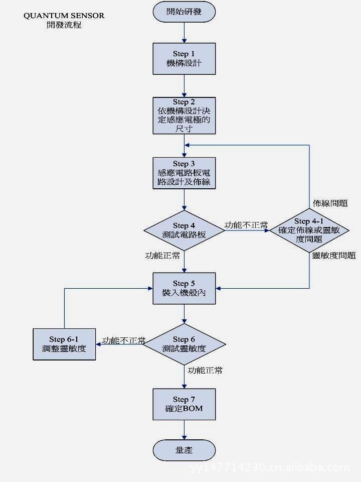使用電容式感應(yīng)的IC設(shè)計(jì)感應(yīng)開關(guān)電路板與其它電路的開發(fā)流程略有不同,因?yàn)殡娙菔介_關(guān)的設(shè)計(jì)上會受到機(jī)構(gòu)與其它電路設(shè)計(jì)上的影響,會有比較多的調(diào)整程序,所以需要一個比較復(fù)雜的開發(fā)流程,現(xiàn)就以出道較早且具有代表性的“Quantum ”產(chǎn)品的開發(fā)流程及要點(diǎn)介紹給大家,希望對需要的朋友有所幫助。下圖是開發(fā)流程圖:
