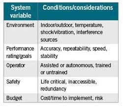MEMS慣性傳感器可靠度高(汽車行業(yè)20年的應(yīng)用歷史證明了這一點(diǎn)),它在手機(jī)和視頻游戲中的成功應(yīng)用說明它在商業(yè)上極具吸引力。然而,不同應(yīng)用對性能的要求大不相同,適合游戲的器件并不能解決本文所述的高性能導(dǎo)航問題。對于導(dǎo)航,重要的MEMS性能指標(biāo)是偏置漂移、振動影響、靈敏度和噪聲。精密工業(yè)和醫(yī)療導(dǎo)航所需的性能水平通常比消費(fèi)電子設(shè)備所用MEMS傳感器的性能水平高出一個(gè)數(shù)量級。表3列出了有助于傳感器選型的一般系統(tǒng)考慮。