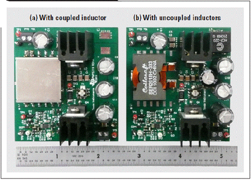 “表 1”所示規(guī)范為設(shè)計比較的基礎(chǔ)。第一個設(shè)計使用一個耦合電感,而第二個則使用兩個非耦合電感。