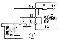 安裝好冷卻液溫度傳感器,將傳感器的連接器插好。當點火開關(guān)置于 ON 位置時,測量圖 1 中連接器“ THW ”端子 ( 豐田車 ) 或 ECU 連接器“ THW ”端子與 E2 間輸出電壓。所測得的電壓應(yīng)與冷卻液溫度成反比變化。