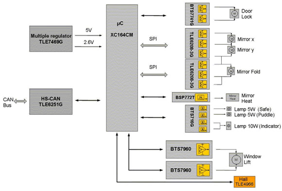 圖5是車門模塊的一個(gè)例子,其中用半導(dǎo)體器件驅(qū)動(dòng)升窗電機(jī),用分立的標(biāo)準(zhǔn)器件驅(qū)動(dòng)其它小型負(fù)載。