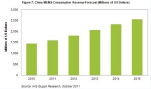 未來幾年,中國市場(chǎng)上增長最快的MEMS領(lǐng)域?qū)⑹鞘謾C(jī)與消費(fèi)市場(chǎng)的麥克風(fēng)、加速計(jì)和陀螺儀。IHS公司預(yù)計(jì),2015年該市場(chǎng)的MEMS銷售額將達(dá)到13億美元,2011-2015年復(fù)合年度增長率為21%。