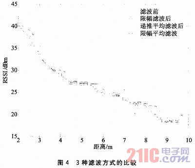 紅外線、GPS和超聲測距都需要額外的硬件,增加了節(jié)點的硬件成本和尺寸。GPS和紅外線測距誤差較大,而利用超聲方法測距很精確,測距誤差只有10 cm,但是受氣溫、濕度等的影響較大,不適合在室外使用?;赗SSI的定位無需額外硬件,利用對接收無線信號的強度判斷,推導(dǎo)收發(fā)節(jié)點間的距離,計算接收無線信號強度是商用無線收發(fā)芯片具備的功能。基于RSSI的測距提供了最廉價的定位方法,而且節(jié)點沒有添加任何部件?;诔暤臏y距雖然定位精度較高,但是需要添加硬件、增加節(jié)點成本和尺寸。所以,基于RSSI的測距是無線傳感器網(wǎng)絡(luò)定位較常采用的方法。首先對RSSI進行預(yù)處理,再通過預(yù)測模型預(yù)測距離的值,不但提高了基于RSSI的測距精度,而且實現(xiàn)了低成本的測距。