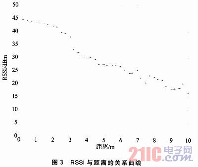 在相同的實驗平臺下,在0~10 m的范圍內(nèi),每間隔0.2 m或者0.3 m記錄RSSI值,每個距離均接收100個左右的數(shù)據(jù)包,對RSSI先進行均值處理,然后得出RSSI值與距離的關(guān)系曲線如圖3所示。