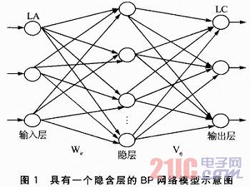 BP網(wǎng)絡(luò)是神經(jīng)網(wǎng)絡(luò)中采用誤差反傳算法作為其學(xué)習(xí)算法的前饋網(wǎng)絡(luò),通常由輸入層、輸出層和隱含層(一層或多層)構(gòu)成。層與層之間的神經(jīng)元采用全互連的連接方式,通過相應(yīng)的網(wǎng)絡(luò)權(quán)系數(shù)w相互聯(lián)系,每層內(nèi)的神經(jīng)元之間沒有連接。圖1所示為具有一個隱含層的BP網(wǎng)絡(luò)模型。其中:LA為BP神經(jīng)網(wǎng)絡(luò)的輸入層,LB為隱層,LC為輸出層,Wir為隱層與輸入層的權(quán)值,Vrj為輸出層與隱層的權(quán)值。
