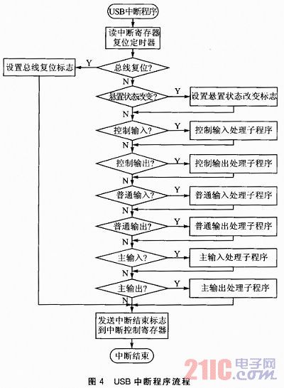 因?yàn)镃8051F321的USB模塊高度集成化,所以對USB接口的設(shè)計(jì)主要是USB固件程序的設(shè)計(jì)。其中最重要的是USB描述符和USB傳輸中斷的處理。當(dāng)USB中斷到達(dá)時(shí),C8051F321首先讀取3個(gè)中斷寄存器(CMINT、IN1INT和OUT1INT)來判斷中斷來源(USB復(fù)位中斷、端點(diǎn)0中斷、端點(diǎn)1輸入中斷、端點(diǎn)2輸出中斷),然后跳入相應(yīng)的處理模塊進(jìn)行處理。USB中斷程序流程如圖4所示。
