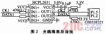 由于系統(tǒng)經(jīng)常工作在工業(yè)現(xiàn)場等領(lǐng)域,各種電磁干擾很常見,為了使系統(tǒng)能穩(wěn)定工作,采用光耦隔離技術(shù)將傳感器和單片機(jī)隔離。光耦隔離原理圖如圖2所示。光耦器件采用HCPL2631高速光耦,輸出引腳OUT1和OUT2經(jīng)過上拉電阻處理后,將CK2和DATA2信號(hào)傳輸給C8051F321單片機(jī)處理。