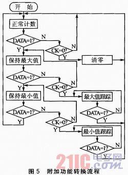 附加功能子程序包括正常計(jì)數(shù)、數(shù)據(jù)保持、最大值跟蹤、最小值跟蹤和清零的功能。對附加功能的實(shí)現(xiàn)均是通過控制CK和DATA信號(hào)線完成,附加功能轉(zhuǎn)換流程如圖5所示。給CK信號(hào)線一個(gè)負(fù)脈沖,即可完成清零操作;在正常計(jì)數(shù)狀態(tài)下將DATA信號(hào)線置為高電平,容柵傳感器將進(jìn)入保數(shù)功能;如果再將CK信號(hào)線置為低電平,容柵傳感器進(jìn)入最大值跟蹤功能;內(nèi)部專用芯片將用新測得的數(shù)據(jù)與上一個(gè)數(shù)據(jù)進(jìn)行比較,如果新測得數(shù)據(jù)大,則替換掉,否則丟棄??梢栽谏衔粰C(jī)上通過USB測試軟件發(fā)送相關(guān)命令來控制系統(tǒng)進(jìn)行操作。程序中設(shè)定一個(gè)字節(jié)的變量來存放從上位機(jī)接收到的命令,當(dāng)判斷是其中的一個(gè)命令時(shí)就調(diào)用相應(yīng)的處理程序完成操作。