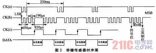 容柵傳感器接口為B531,信號(hào)線有4根:電源線(1.5 V)、地線(0 V)、時(shí)鐘線(CK)、串行數(shù)據(jù)線(DATA),并且通過控制CK、DATA信號(hào)線的電平可以實(shí)現(xiàn)容柵傳感器的不同功能比,如最大值跟蹤、最小值跟蹤、數(shù)據(jù)保持和清零等。