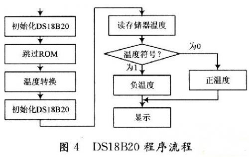 要進(jìn)行溫度控制,首先要測(cè)量所控制目標(biāo)的溫度值,在本系統(tǒng)中,具體使用數(shù)字溫度傳感器DSl8B20與DSP結(jié)合,并利用CCS編寫(xiě)程序,本系統(tǒng)開(kāi)發(fā)平臺(tái)為CCS 2.2,前期安裝及芯片設(shè)置在此省略,程序流程如圖4所示。