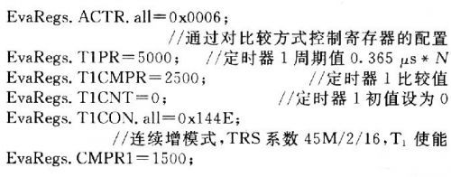 TMS320的事件管理模塊總共能輸出16路PWM信號(hào),文中僅需要輸出一路占空比可調(diào)的PWM信號(hào),并設(shè)計(jì)從PWMl引腳輸出該方波信號(hào)。文中選用通用定時(shí)器1(T1)作為時(shí)基;全比較單元1保存調(diào)制值;計(jì)數(shù)方式采用連續(xù)增計(jì)數(shù)模式。PWM占空比值與T1的三角波數(shù)據(jù)比較,輸出PWM信號(hào)控制半導(dǎo)體制冷片工作。各寄存器設(shè)置如下(高速外設(shè)時(shí)鐘為22.5 MHz):