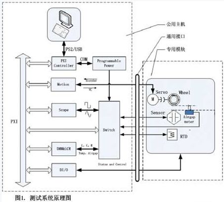 目前,汽車傳感器沒有一個(gè)統(tǒng)一的行業(yè)標(biāo)準(zhǔn),基本是按照使用者的要求定制。譬如目標(biāo)輪及其轉(zhuǎn)速、空氣氣隙和傳感器的安裝尺寸各不相同,即使是傳感器裝配到同一種車型上,也會(huì)隨著安裝位置的不同而存在差異。但是,同一臺(tái)設(shè)備不可能滿足全部傳感器的測(cè)試要求,由此引入模塊化的設(shè)計(jì)思想,即系統(tǒng)中相同的部分,如測(cè)試儀器、測(cè)試軟件、氣動(dòng)控制系統(tǒng)、主電路系統(tǒng),作為公用資源(這里稱為“主機(jī)”);對(duì)系統(tǒng)中要求隨著傳感器變化的部分,如目標(biāo)輪及馬達(dá)、夾具及專用電路,被看成模塊。主機(jī)和模塊之間采用快插的方式完成電氣連接且為標(biāo)準(zhǔn)化接口,可進(jìn)行后續(xù)擴(kuò)展。當(dāng)測(cè)試不同傳感器時(shí),選用不同的測(cè)試模塊連接到主機(jī)上即可。