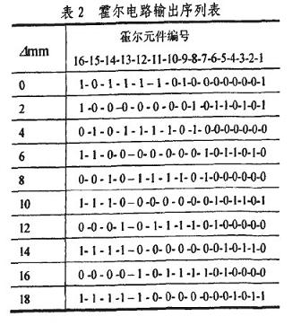 霍爾電路的工作原理是,在外磁場(chǎng)的作用下,當(dāng)磁感應(yīng)強(qiáng)度B超過(guò)導(dǎo)通工作點(diǎn)時(shí),霍爾電路輸出管導(dǎo)通,輸出低電-半:若曰值低于釋放點(diǎn)時(shí),輸出管截止,輸出高電半。因此在“凸槽”時(shí)鋼質(zhì)活塞桿被磁化,磁感應(yīng)強(qiáng)度曰增加,霍爾電路導(dǎo)通,輸出低電平,用“1”表示;在“凹槽”時(shí)輸出高電平,用“0”表示。以第1個(gè)霍爾元件為測(cè)量基準(zhǔn),從圖2所示時(shí)刻起,位移暈旃次變化b=2mm時(shí),一個(gè)碼區(qū)行程內(nèi)霍爾電路輸出的二進(jìn)制序列如表2所示。分析可知,序列的標(biāo)識(shí)碼為l 0000000 1,其前面或后面6位序列數(shù)分別為相鄰的兩個(gè)數(shù)值碼,這使它具有很強(qiáng)的容錯(cuò)能力。標(biāo)識(shí)碼每隔一個(gè)霍爾元件間距N在低位部分右移一位。值得注意的是,標(biāo)識(shí)碼前面的數(shù)值碼代表磁性標(biāo)尺當(dāng)前檢測(cè)位置下一個(gè)碼區(qū)的值。