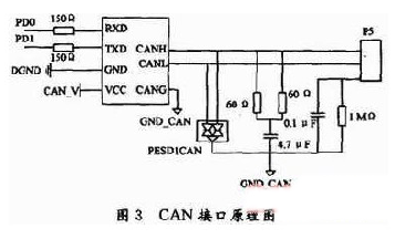 CAN接口原理圖如圖3所示,LM3S8962對應(yīng)的CAN接口分別為PD0和PD1,將其與CTM8251進行電氣連接,通過對CTM8251進行相應(yīng)的電路配置,并且在信號輸出端做好相應(yīng)的屏蔽工作以防止噪聲干擾傳輸和靜電帶來的不安全因素,最后將CTM8251輸出的高、低端分別與器件相應(yīng)引腳連接。