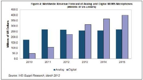 據(jù)IHS公司的MEMS專題報告,由于具有對電磁干擾的免疫力較高和設(shè)計階段具有更大的靈活性等優(yōu)點,越來越多地被用于手機(jī)、筆記本以及蘋果iPad等暢銷產(chǎn)品之中,數(shù)字MEMS麥克風(fēng)的銷售額明年將超過模擬產(chǎn)品。