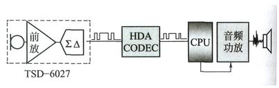數(shù)字傳聲器,顧名思義就是直接輸出數(shù)字脈沖信號(hào)的傳聲器電聲器件。從應(yīng)用角度來劃分,可以分為兩類:一類為USB接口的數(shù)字傳聲器,其核心電聲換能器件仍為模擬音頻輸出信號(hào),經(jīng)過USB接口音效芯片轉(zhuǎn)換為PC格式的數(shù)字信號(hào)輸出接口,此類傳聲器多數(shù)作為PC周邊配套外設(shè),如USB接口錄音傳聲器、USB接口耳麥等,嚴(yán)格說來,此類數(shù)字傳聲器應(yīng)稱為數(shù)字接口傳聲器。另一類為真正意義上的數(shù)字傳聲器,此類傳聲器采用內(nèi)置阻抗變換、前置增益、A/D編碼器的IC芯片,作為電聲換能器件直接輸出的便是脈沖數(shù)字信號(hào),可以直接與相應(yīng)的編解碼芯片( CODEC)進(jìn)行數(shù)字信號(hào)的傳輸。數(shù)字傳聲器接口原理如圖1