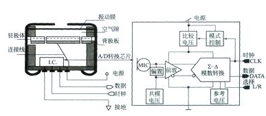 數(shù)字傳聲器結(jié)構(gòu)及模數(shù)轉(zhuǎn)換芯片原理見圖2.