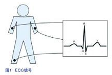 心電圖機(jī)(ECG)可實(shí)時(shí)記錄病人的心跳活動(dòng)。心跳信號(hào)是通過三個(gè)連接到病人身體的電極測量出來。圖1所示為其中一個(gè)電極輸出的ECG信號(hào),圖中包含有五個(gè)測量點(diǎn),分別是Q、P、R、S、和T,這些測量點(diǎn)可用來診斷病人患上心臟病的可能性?! ?br />