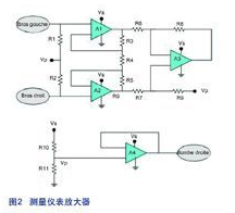 正如上述所說,ECG的信號(hào)路徑必須能調(diào)理不同來源的噪聲。對抗直流電噪聲,可以使用高通濾波器。然而,最令人頭痛的是50Hz的噪聲,因?yàn)樗鼊偤门c我們收集的信號(hào)頻率處于相同范圍。要消除這個(gè)共模噪聲,需要建立一個(gè)測量儀表放大器。這個(gè)配置之所以很理想是因?yàn)樗稍谝种乒材k妷旱耐瑫r(shí)放大有用的差分信號(hào),這利于把微弱的有效信號(hào)從背景噪聲中分隔出來。正如圖2所示,這個(gè)儀表放大器是用LMP2234(四通道、微功率、高精度的RRO運(yùn)算放大器)和高精度的電阻器(0.1%)實(shí)現(xiàn)出來?! ?br />