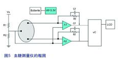 圖5所示為一個(gè)完整方案的框圖,該系統(tǒng)是由電池供電并可使用LM2623來提供3.3V的電源電壓。通過電極量度出來的電流之后會(huì)經(jīng)由一個(gè)運(yùn)算放大器被轉(zhuǎn)換成一個(gè)電壓,這個(gè)電壓再被送到微控制器處理,最后顯示在LCD熒幕上。