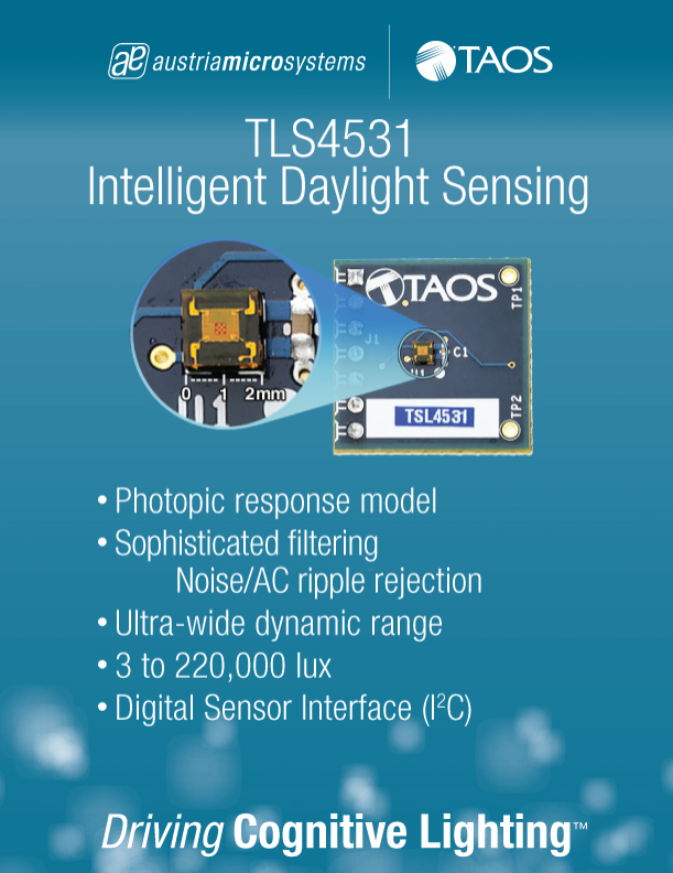 新的傳感器系列由2011年被奧地利微電子收購的全球領(lǐng)先智能照明傳感器提供商TAOS所研發(fā),可提供從3勒克斯至220,000勒克斯的動態(tài)范圍,可防止直射陽光下的傳感器輸出飽和,并通過運(yùn)用適光反應(yīng)模型使傳感器的輸出與人眼的感知一致。