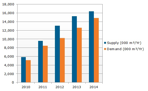 根據(jù)NPD DisplaySearch觸控感應(yīng)器產(chǎn)能統(tǒng)計(jì)報告Touch Sensor Manufacturing Capacity指出,2011年主要的觸控傳感器,包含電阻式、投射式電容、單片式投射式電容(sensor-on-cover)和面板內(nèi)嵌式投射式電容(on-cell)觸控感應(yīng)器的總產(chǎn)量為960萬平方米,較2010年的580萬平方米取得了66%的年增長率。NPD DisplaySearch預(yù)測,2012年觸控感應(yīng)器將達(dá)到1千3百萬平方米,并將于2014年上升到1千640萬平方米。