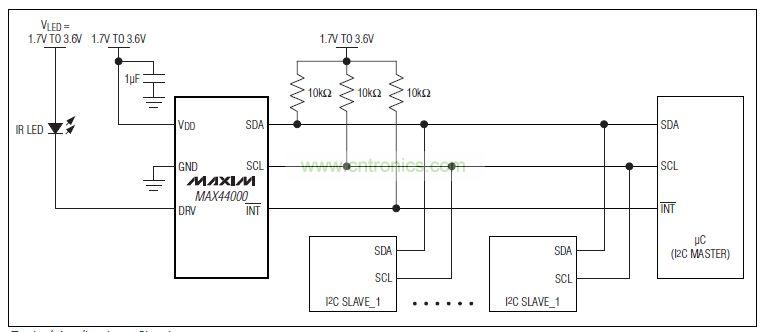 MAX44000設(shè)計(jì)用于驅(qū)動(dòng)外部IR LED,工作在1.7V至3.6V VDD供電電源。只有環(huán)境光傳感器工作時(shí),器件消耗5µA電流,使能接近檢測接收器和驅(qū)動(dòng)器后,器件僅消耗7µA電流。