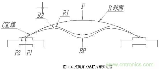 彈片自由狀態(tài)時,支撐點為P1,當外力“F”開始向下施力時,彈片開始變形及位移,此時開始產(chǎn)生曲線。在以P1為支撐點時,外力“F”造成彈片變形,會產(chǎn)生最小的R1,此時的外力“F”即為彈片的OF值。過了彈片OF值位置時,支撐點P1會開始向P2位移,只要P1一位移,則R1又會變大,造成OF值變小,此時曲線即產(chǎn)生向下曲線(CK)。當達到P2時,即為P2支撐之最大R2,此時即達到彈片的BP點(最小OD點)。若此時外力“F”繼續(xù)施力,則曲線又會向上產(chǎn)生曲線,上述過程如圖1.4所示。