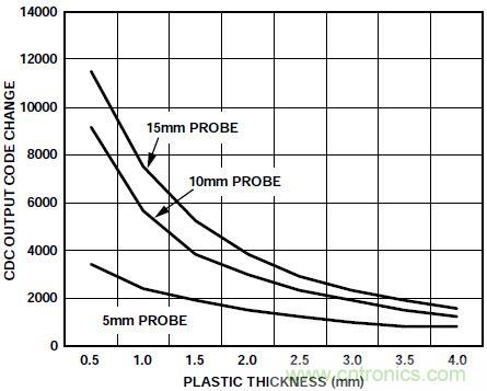 收集典型按鈕傳感器響應(yīng)數(shù)據(jù)采用10 mm × 10 mm的按鈕傳感器來實現(xiàn)。為了模擬用戶的手指,采用了各種尺寸的接地金屬探頭來激活按鈕。傳感器PCB位于厚度為0.5 mm至4 mm的塑料下方。傳感器響應(yīng)定義為傳感器接觸和未接觸狀態(tài)下CDC輸出代碼的變化。