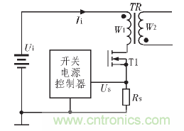 開關(guān)電源從控制方式上可分為電壓控制型和電流控制型,從隔離變壓器的驅(qū)動(dòng)方式上可分為單端型和雙端型。在這些電路形式中, 許多形式的開關(guān)電源需要使用電流傳感器檢測(cè)電流,或者用于脈沖占空比的控制,或者用于電路的保護(hù)。電流控制型開關(guān)電源直接對(duì)輸入的脈沖電流進(jìn)行檢測(cè),能同時(shí)根據(jù)輸入電壓和輸出電壓的變化綜合調(diào)節(jié)脈沖占空比,具有動(dòng)態(tài)響應(yīng)速度快,輸入電壓的波動(dòng)對(duì)輸出電壓影響小等特點(diǎn)。電流控制型開關(guān)電源中需要電流傳感器檢測(cè)輸入的脈沖電流, 以作為開關(guān)電源調(diào)節(jié)脈沖占空比、穩(wěn)定輸出電壓的反饋信號(hào)。圖1 所示為一個(gè)電流控制型的反激式開關(guān)電源的輸入通道原理圖。圖中電阻RS在電路中的作用即是電流傳感器, 在功率開關(guān)T1導(dǎo)通時(shí), 流過隔離變壓器原邊繞組W1的電流Ii將使RS上產(chǎn)生電壓降US,US即為向開關(guān)電源控制器反饋的輸入電流值信號(hào)。根據(jù)輸出電壓反饋信號(hào)和輸入電流值反饋信號(hào)US, 開關(guān)電源控制器將綜合調(diào)節(jié)電路的脈沖占空比,保證輸出電壓的穩(wěn)定。