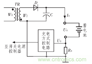 為了提高開關(guān)電源工作的可靠性,防止輸出電流過流等情況發(fā)生,許多開關(guān)電源在輸出端接入電流傳感器,檢測(cè)輸出電流的大小,一旦輸出電流超過設(shè)計(jì)標(biāo)準(zhǔn),保護(hù)電路即采取必要措施保護(hù)開關(guān)電源的安全[3]。此外,當(dāng)開關(guān)電源作為蓄電池充電器時(shí),也需要檢測(cè)輸出電流的大小,以此了解蓄電池的充電情況,適時(shí)切換充電方式,達(dá)到提高充電效率,延長(zhǎng)蓄電池的使用壽命的效果。圖3 為一個(gè)蓄電池充電器的輸出電流檢測(cè)原理圖, 電流檢測(cè)電阻RS將蓄電池的充電電流轉(zhuǎn)化為電壓US,反饋給充電方式控制電路,由控制電路根據(jù)充電電流的大小適時(shí)切換充電方式[4]。