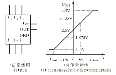 常用的TBC-DS 系列閉環(huán)霍爾電流傳感器的引線框圖和傳輸特性如圖5 所示[6]。圖5(a)所示的霍爾電流傳感器引線中,I+1~3和I-1~3是被測(cè)電流的串入繞組引腳, 其中,I+1和I-1是一個(gè)被測(cè)電流繞組的引腳,I+2和I-2、I+3和I-3也分別各是一個(gè)被測(cè)電流繞組的引腳。當(dāng)3 個(gè)被測(cè)電流繞組并聯(lián)時(shí),霍爾電流傳感器的額定測(cè)量電流為IPN1; 若將兩個(gè)繞組并聯(lián)再與一個(gè)繞組串聯(lián)時(shí),霍爾電流傳感器的額定測(cè)量電流為IPN2;若將3 個(gè)繞組相互串聯(lián)時(shí),霍爾電流傳感器的額定測(cè)量電流為IPN3。3 個(gè)額定測(cè)量電流間的關(guān)系為:IPN1=2 IPN2=3 IPN3。可見,通過3 組被測(cè)電流繞組的不同接法,可以改變霍爾電流傳感器的額定測(cè)量電流值,擴(kuò)展測(cè)量區(qū)間。VCC為電源引腳,電源電壓通常為5 V;GND 是電源和傳感器輸出電壓的地;OUT 是傳感器電壓輸出引腳。由5(b)所示的霍爾電流傳感器傳輸特性可見,當(dāng)被測(cè)電流為0 時(shí),其輸出電壓UOUT =2.5 V;當(dāng)被測(cè)電流不為0 且方向?yàn)閺腎+至I-時(shí),輸出電壓UOUT>2.5 V,當(dāng)被測(cè)電流不為0 且方向?yàn)閺腎-至I+時(shí),輸出電壓UOUT<2.5 V。IPN和-IPN是霍爾傳感器的正負(fù)額定電流, 當(dāng)被檢測(cè)電流達(dá)到額定電流時(shí),根據(jù)電流方向的不同,輸出電壓UOUT 的值分別為3.125 V 或1.875 V, 即相對(duì)于2.5 V 的中心值有±0.625 V的偏移。當(dāng)被檢測(cè)電流值絕對(duì)值大于IPN 時(shí),霍爾傳感器仍可輸出與被檢測(cè)電流成線性關(guān)系的電壓值,直至被檢測(cè)電流達(dá)到霍爾傳感器的最大檢測(cè)電流IPmax。通常,IPmax>3 IPN。