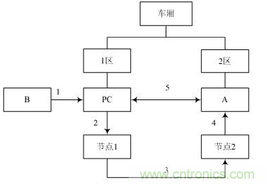 系統(tǒng)設(shè)計(jì)方案非常簡單。一般來講火車車廂全長26.6 m ,而無線傳感器網(wǎng)絡(luò)(wireless sensor net2works ,WSN)的通信距離在幾十米到幾百米之間,一般為30 m ,因此一個(gè)節(jié)點(diǎn)就可以完全覆蓋整個(gè)車廂。在系統(tǒng)中只有2個(gè)節(jié)點(diǎn)(不需PC協(xié)助) :節(jié)點(diǎn)1作為發(fā)信者,節(jié)點(diǎn)2作為收信者,組成最簡單的網(wǎng)絡(luò),不需跳轉(zhuǎn)。系統(tǒng)的結(jié)構(gòu)簡單,使得傳輸時(shí)延非常小,比較適合應(yīng)用在上文中提到的場合。