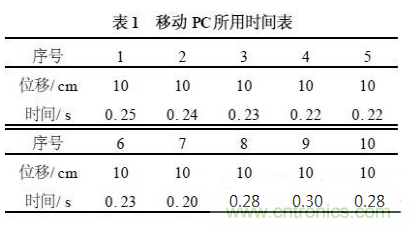 現(xiàn)在通過簡單實(shí)驗(yàn)獲取數(shù)據(jù)來計(jì)算人為移動(dòng)引起的az :隨意從桌上拿起筆記本,重復(fù)10次,記錄短距離10 cm)所用時(shí)間。得到10組數(shù)據(jù)如表1所示。