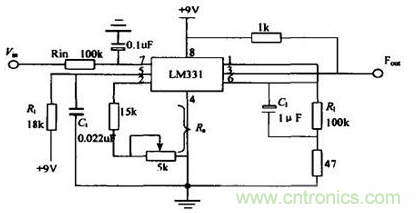 電阻Rs、R1、Rt和電容Ct直接影響轉(zhuǎn)換結(jié)果Fout,因此對(duì)元件的精度要有一定的要求,可根據(jù)轉(zhuǎn)換精度適當(dāng)選擇,其中Rt、Ct、Rs、R1要選用低溫漂的穩(wěn)定元件,Cin可根據(jù)需要選擇0.1uF 或1uF 。電容C1對(duì)轉(zhuǎn)換結(jié)果雖然沒有直接的影響,但應(yīng)選擇漏電流小的電容器。電阻R1和電容C1組成低通濾波器,可減少輸入電壓中的干擾脈沖,有利于提高轉(zhuǎn)換精度。電路中的47Ω 電阻對(duì)確保電路線性失真度小于0.03% 是十分必須的。