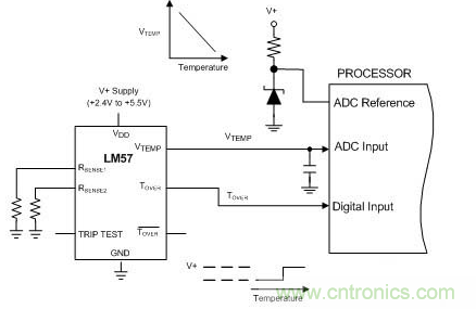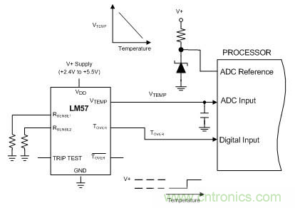 處理器的模數(shù)轉(zhuǎn)換器用于采集溫度模擬電壓(VTEMP)。當(dāng)溫度超出臨界值時(shí),過熱(TOVER)輸出端會(huì)驅(qū)動(dòng)處理器的輸入端進(jìn)行指示。跳脫點(diǎn)由兩個(gè)無源電阻器(RSENSE1和RSENSE2)設(shè)置,而不是由有效參考端和偏壓電阻器設(shè)置。