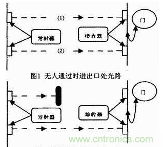 本設(shè)計的改進之處是設(shè)計一個具有計數(shù)功能的模塊,我們可以使用對射型光電傳感器,如圖1所示在洗手間的進口處設(shè)置兩個發(fā)射源和兩個接收源,當(dāng)有人進或者出洗手問的門時,會阻擋光線,如圖2所示,接收處就接收不到設(shè)置光源發(fā)出的光信號,這時接收處的輸出端會發(fā)出一個信號,計數(shù)器就可以通過此信號進行計數(shù)。只要計數(shù)器里存儲數(shù)等于一時,系統(tǒng)控制燈亮,大于零時,該系統(tǒng)就會控制燈一直亮著,一旦為零,系統(tǒng)會控制燈延時一小段時間后自動熄滅。由于整個系統(tǒng)初啟動時無法判斷室內(nèi)是否有人,因而我們還會設(shè)置一個簡易開關(guān),供使用者進行手控,且為方便使用者能在夜間看到開關(guān)的位置,我們可以采用表面具有夜光性能的材料來做按鍵。光電檢測系統(tǒng)的啟動由光敏傳感器控制。