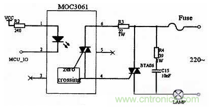 本系統(tǒng)由光電傳感器檢測洗手間內(nèi)是否有人,單片機進行計數(shù),當(dāng)N不為零時,單片機會向與MOC3061芯片引腳相連的端口輸送信號,然后通過可控硅來控制燈的開、關(guān)。其中R3是雙向可控硅的門極電阻,當(dāng)可控硅靈敏度較高時,門極阻抗也很高,并上R3可提高抗干擾能力。 39Ω電阻和0.01μF電容組成浪涌吸收電路,防止浪涌電壓損壞雙向可控硅。其電路圖如圖4所示。