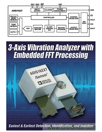 在一些應(yīng)用案例中,相對(duì)簡(jiǎn)單的傳感器輸出可能就足夠了,但在另一些應(yīng)用中(例如,通過(guò)震動(dòng)分析進(jìn)行狀態(tài)監(jiān)控),則需要增加相當(dāng)多的處理過(guò)程才能實(shí)現(xiàn)所需的輸出。圍繞慣性傳感器而構(gòu)建的一個(gè)高集成度器件示例是ADIS16227(見(jiàn)圖2),它是一款完全自治的頻域震動(dòng)監(jiān)控器。此類(lèi)器件可能不提供相對(duì)簡(jiǎn)單的g/mV輸出,而是提供特定應(yīng)用分析。在本例中,其嵌入式頻域處理、512點(diǎn)實(shí)值FFT和片上存儲(chǔ)器能夠識(shí)別各震動(dòng)源并進(jìn)行歸類(lèi),監(jiān)控其隨時(shí)間的變化情況,并根據(jù)可編程的閾值做出反應(yīng)。