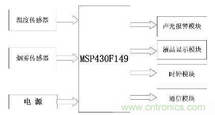 該系統(tǒng)以單片機MSP430F149 為核心,以環(huán)境溫度、煙霧濃度作為判斷火災(zāi)的依據(jù),完成了對火災(zāi)的預(yù)警。主要由單片機控制模塊、時鐘模塊、煙霧濃度測量模塊、DS18B20溫度測量模塊、聲光報警模塊、1602 液晶顯示模塊和電源構(gòu)成。
