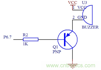 蜂鳴器在微處理器判斷為火災(zāi)時發(fā)出報警指示音。由于單片機的I/O 口驅(qū)動能力有限,選用PNP型晶體管2N5401 組成晶體管驅(qū)動電路來驅(qū)動壓電式蜂鳴器。