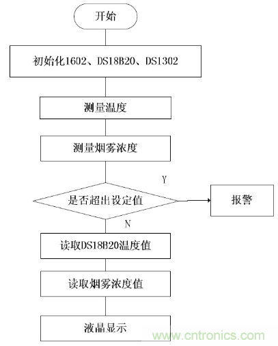 系統(tǒng)軟件流程圖上電后首先對單片機、1602 和DS1302 進(jìn)行初始化,初始化完成后,對溫度和煙霧濃度進(jìn)行測量,將測量值與設(shè)定值進(jìn)行比較,如果超出設(shè)定范圍,則進(jìn)行報警,如果未超出,則在液晶上顯示時間、溫度值和煙霧濃度值。