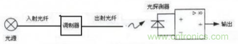 調(diào)制器是敏感元件,置于入射光纖和接收光纖之間,在被測對象的作用下,使敏感元件的光路遮斷或使敏感元件的光穿透率發(fā)生變化,這樣,光探測器所接收的光量便成為被測對象調(diào)制后的信號,經(jīng)放大、解凋后,就可得到被測對象。