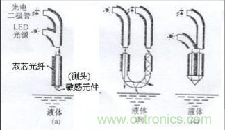 光纖液位傳感器的工作原理如圖3(b)所示。發(fā)光器件射出來的光通過傳輸光纖送到敏感元件,在敏感元件的球面上,有一部分透過,而其余的光被反射回來。當(dāng)敏感元件與液體相接觸時,與空氣接觸相比,球面部的光透射量增大,而反射量減少。因此,由反射光量即可知道敏感元件是否接觸液體。反射光量決定于敏感元件玻璃的折射率和被測定物質(zhì)的折射率。被測物質(zhì)的折射率越大,反射光量越小。來自敏感元件的反射光,通過傳輸光纖由受光器件的光電晶體管進(jìn)行光電轉(zhuǎn)換后輸出。敏感元件的反射光量的變化,若以空氣的光量為基準(zhǔn),在水中則為-6-—7dB,在油中為-25—30dB??蓪Ψ瓷涔饬坎顒e很大的水和油等進(jìn)行物質(zhì)判別。
