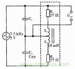如圖1如果沒有C1和C2為普通半橋電路,虛線框中為電感傳感器的等效電路,傳感器測頭的位移帶動(dòng)螺線管中鐵芯上下移動(dòng),從而改變上下兩個(gè)線圈的電感值。將兩線圈等效成純電阻和純電感的串聯(lián),如圖中R1和L1組成上線圈,R2和L2組成下線圈,輸出接在上線圈上。實(shí)際傳感器中線圈與輸出的接線不會變,只是通過鐵芯移動(dòng)來改變電感,所以R1和R2固定不變。