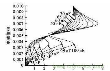 對于半橋時(shí)電路II由于希望鐵芯在最下方時(shí)回路II諧振,最上方時(shí)回路I諧振,因?yàn)長1和L2的變化范圍為3~7 mH。L2為7 mH時(shí)回路II諧振,L1為7 mH時(shí)回路I諧振。按照仿真條件計(jì)算C1=C2=65 nF。簡化仿真不妨取C1=C2,在65 nF附近從55~100 nF間隔5 nF進(jìn)行仿真,觀察電路性能,仿真結(jié)果如圖2所示。