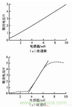 經(jīng)Matlab計(jì)算普通半橋在3~7 mH段,電壓變化范圍1.5~3.5 V,電壓對電感的靈敏度為0.5V/mH。線性度近似為1。對圖3(b)采用最小二乘法擬合直線后,在3.8~6.3 mH段,輸出電壓的變化范圍0.77~4.39 V。線性度可達(dá)2.39%,靈敏度為1.448 V/mH。
