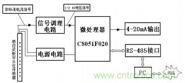 該系統(tǒng)的主要結構框圖如圖1所示,主要由感應式數(shù)字水位傳感器、信號調理電路、電源電路、MCU最小系統(tǒng)、4~20 mA輸出(AD421)、RS-485接口(MAX485),另外還包括PC,通過PC上位機監(jiān)控軟件實現(xiàn)網(wǎng)絡通信功能。