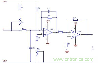 信號調理電路中還設計濾波電路,是為了濾去測量現(xiàn)場的干擾,例如電氣干擾、電磁干擾,使系統(tǒng)的信噪比增加。如圖2所示,電阻R2和電容C1組成簡單的無源RC低通濾波器。電阻R3、R7,電容C2及運放組成一階反相輸入RC有源低通濾波器,有源濾波器比無源濾波器具有更優(yōu)越的性能,提高了頻率特性值,改善了選擇性。