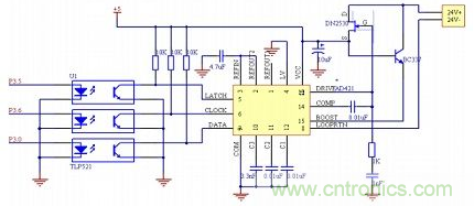 AD421是ADI公司推出的一款單片高性能數(shù)模轉換器(DAC)。它由16位數(shù)字信號以串行方式輸入,4~20 mA電流輸出,在智能儀表方面應用廣泛。AD421與單片機的連接主要有串行數(shù)據(jù)輸入端和控制端,在時鐘CLOCK作用下,輸入移位寄存器把DATA引腳上的數(shù)據(jù)逐位讀入,LATCH鎖存脈沖把寄存器中的數(shù)據(jù)鎖存到DAC中。根據(jù)其工作原理,AD421與C8051F020芯片的接口電路如圖3所示。AD421的數(shù)據(jù)接口和單片機P3.0口相連,用來接收16位的串行數(shù)據(jù)。單片機P3.6口用來產生時鐘信號,而P3.5口用來產生鎖存信號。在實際應用中,為了保證信號的傳輸,一般要在單片機和AD421之間加入隔離器件,實現(xiàn)通訊的隔離,常用的方法有使用ADI推出的ADUM系列隔離器件,比如ADuM 1310,或者使用光耦。在這里,采用光耦來實現(xiàn)通訊的隔離。